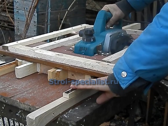 Очевидно, что такую же систему можно использовать и при обработке погонажного материала, а не только широких и коротких заготовок, но при этом, в отличие от рейсмусового станка и предыдущего варианта использования электрорубанка в его качестве, вы будете двигать не заготовку, а самостоятельно передвигаться вдоль нее.