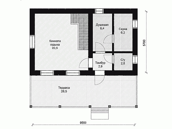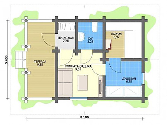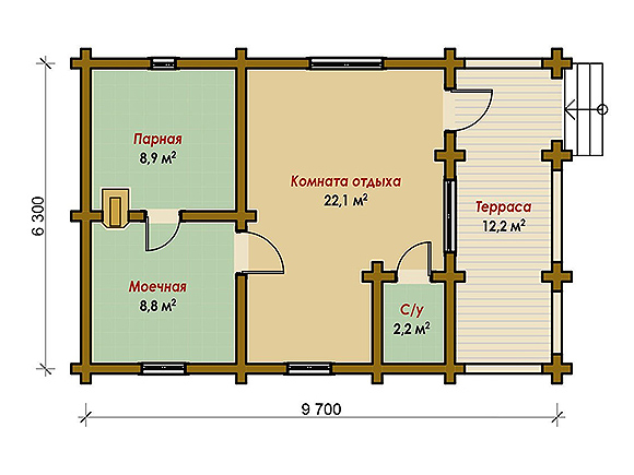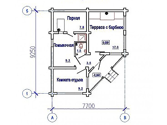 Единственное, что бы мы посоветовали рассмотреть при его возможной реализации, так это размещение санузла в помывочной, без ущерба для ее функциональности, и за счет этого, увеличения площади комнаты отдыха. В таком варианте наличие тамбура может быть и не оправданным.