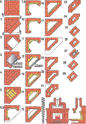Для его строительства подберите из великого множества предложений в интернете подходящий внешний вид, определите расположение в комнате, размеры и прочие составляющие. Обязательно выберите вариант с порядовкой, дабы избежать многих ошибок при самостоятельном ее вычерчивании. Хотя, если вы – натура творческая и готовы к возможным переделкам – рискните, вооружившись данными о сечении дымохода в зависимости от размера топки (но не менее 1 кирпича!), углах наклона стенок топки и каминного зуба прочее.
