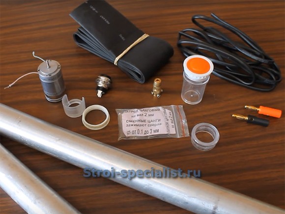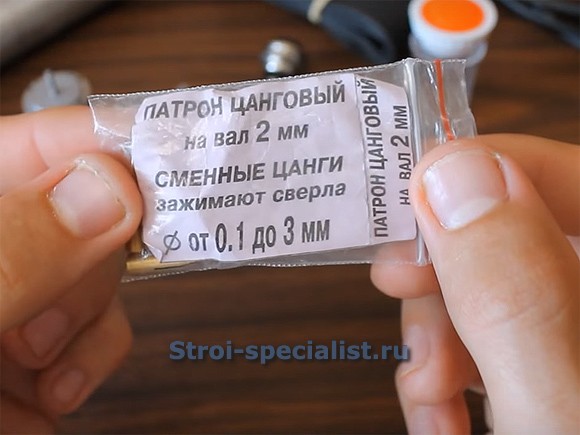 Кнопка может быть с фиксацией или без. Цанговые зажимы подбираются в радиомагазине по хвостовику двигателя (этот – 2 мм) и диаметрам хвостовиков инструмента, который планируется использовать для работы. Здесь, разнообразие вариантов еще больше, чем при выборе двигателя.