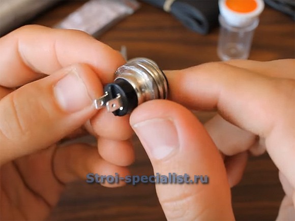 5. Соединяем провода через кнопку. Лучше – методом пайки. И, конечно же, не забываем использовать в местах пайки термоусадочную трубку, чтобы исключить малейшую возможность короткого замыкания.