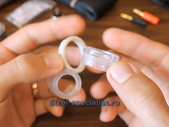 4. Ограничительные колечки и посадочное место для кнопки вырезаем из подходящей по размерам пластиковой тары из под медпрепаратов, детских игрушек типа мыльных пузырей прочее.