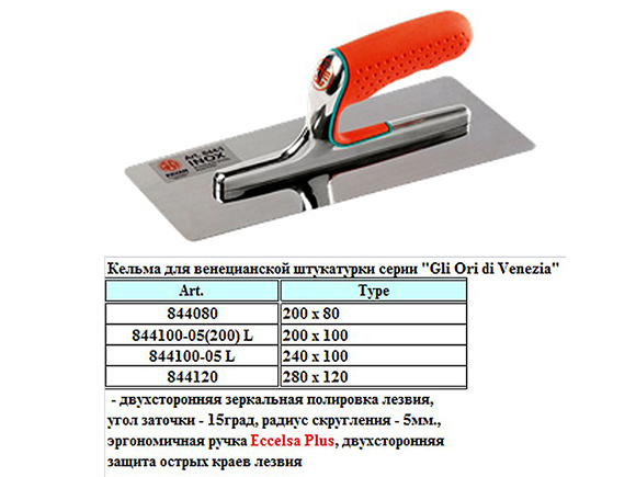 Само же название венецианской кельмы, подразумевает ее основное предназначение – нанесение штукатурных смесей на основе мраморной пыли и им подобных, а вот типоразмеров и конфигураций, различающихся степенью вогнутости, скругленности углов прочее и здесь хватает. Так длина такой кельмы может колебаться, но основными являются размеры: 200 х 80 и 240 х 100 мм. Несмотря на свое основное предназначение, такие кельмы являются довольно универсальным инструментом.