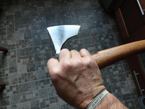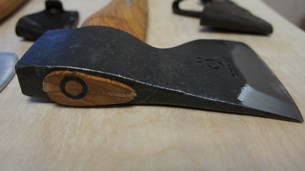 Выше лезвия такой топор также имеет достаточно тонкое сечение. Да и массивный обух ему также не нужен, ведь его основная задача – снимать тонкую стружку или обтесывать доски (а не древесные стволы). Иногда такие топоры и затачиваются как бритвы, но если ими приходится снимать достаточно большие пласты древесины, то может возникнуть эффект залипания лезвия в ней. Мастер сам выбирает способ и характер заточки.