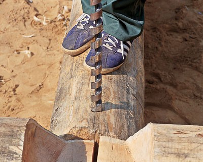 Особое внимание следует уделить подготовке посадочного отверстия для установки плотницких шкантов. Для этого понадобятся мощная дрель и длинный бур подходящего диаметра.