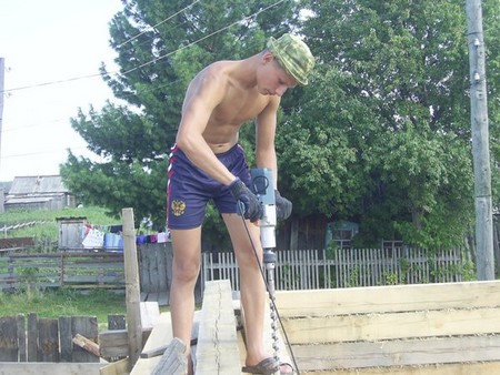 Бревно или брус верхнего венца просверливают насквозь, нижнего – примерно на половину. Для контроля глубины сверления удобно на сверле закрепить упор или наклеить в несколько оборотов бумажный скотч. Шаг сверления отверстий не должен превышать 1 метра.