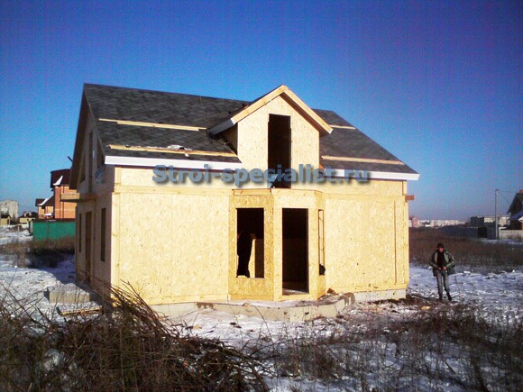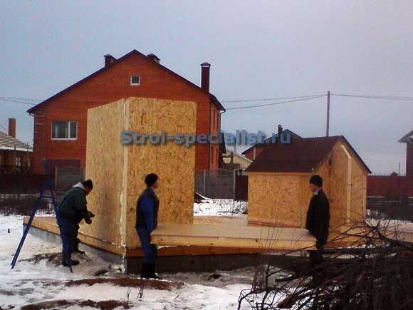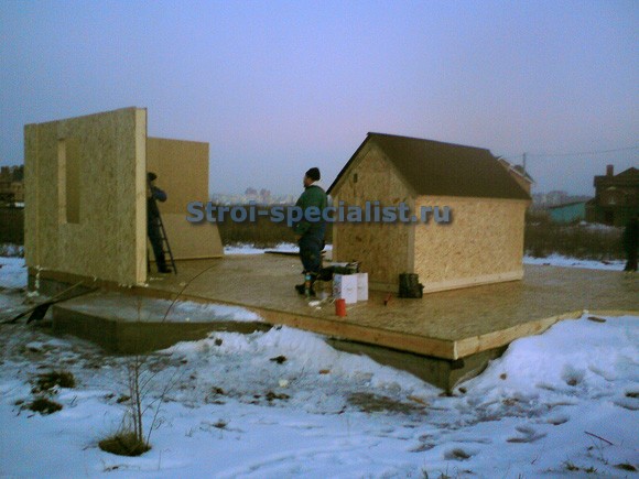 Подавляющее большинство людей, рассматривающих эти фотографии, задают вопрос о маленьком домике. Это бытовка, в которой можно согреться, оставить рабочую одежду и инструмент. Он собрана из тех же СИП-панелей и остается внутри возводимого дома до финишных отделочных работ, когда в доме уже и отопление функционирует. Затем она разбирается и выносится из дома отдельными панелями.