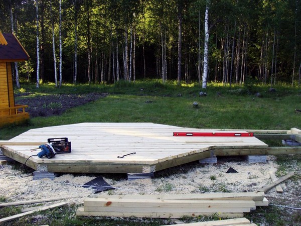 Рассмотрим, как это можно сделать. Самый простой вариант, когда балки обвязки служат лагами будущего пола. Иногда для легких летних каркасных домиков бывает достаточно просто уложить половую доску – и пол готов. Это же подойдет для террас, беседок или других, не отапливаемых помещений. Также подобный пол можно рассматривать, как подготовительный этап для устройства сверху отдельной половой конструкции с утеплителем. Кстати, это не лишено смысла и в случае, когда вы хотите минимизировать звукопередачу по каркасу дома.
