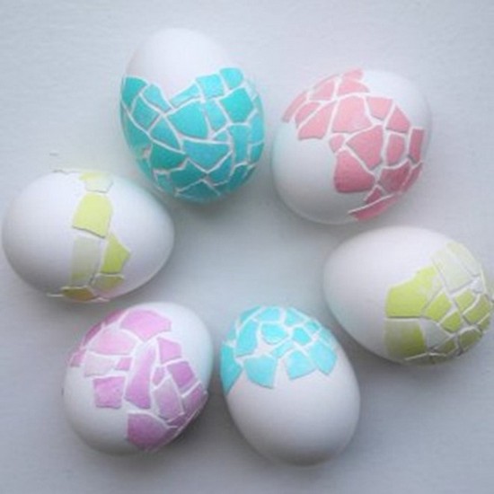 Кусочками разноцветной мозаики можно оклеивать не всю поверхность яйца, а только отдельные участки. Необычный и креативный способ украшения непременно привлечет внимание ваших гостей.