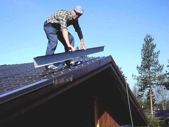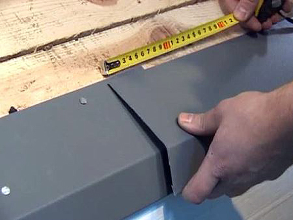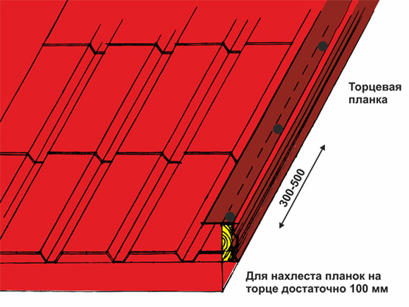 Крепление планки производится в двух плоскостях теми же саморезами с резиновой (а лучше – полиуретановой) шайбой, что использовались при монтаже всей кровли с шагом 300 – 500 мм. В плоскости крыши планка прикручивается через вторую от края волну. К торцевой доске желательно крепить по центральной линии примыкающей к ней полки, хотя последнее – чисто из эстетических соображений. Нахлест двух элементов нужно также делать не менее 50 мм, причем обязательно, чтобы находящийся выше элемент накрывал расположенный ниже. Установка крепежа в месте стыка через два металла – желательна. Верхний стык торцевых планок двускатной крыши накрывается коньковым элементом. Иногда для большей герметичности стыка используют двусторонний скотч или другие уплотнительные элементы.