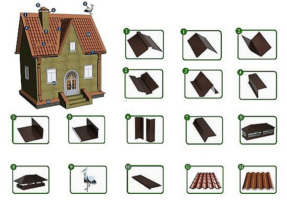 При устройстве крыш из профнастила огромную роль играют так называемые доборные элементы, занимающие в общей площади крыши мизерно малое место (до 3% в самых сложных крышах). Но от них в значительной степени зависит срок службы кровли в целом.