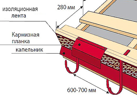 Обязательная при металлической кровле пленка гидробарьера на крайней доске, к которой крепится карнизная планка, выводится из-под обрешетки и укладывается поверх планки. Таким образом, сконденсировавшаяся под поверхностью профнастила влага по карнизной планке стечет прямиком в желоб отливной системы, или сорвется с капельника при ее отсутствии и гарантированно не попадет на деревянные конструкции крыши.