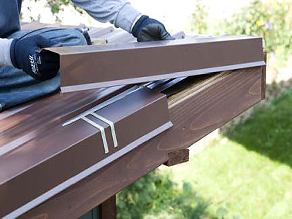 Также большинство крупных строительных магазинов торгуют гнутым металлическим профилем основной цветовой гаммы, который может быть использован в качестве ветровой и карнизной планок.
