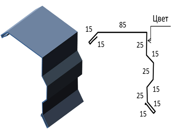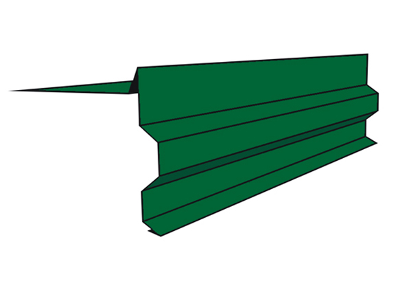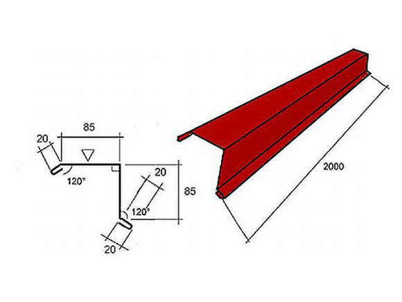Ветровая планка монтируется на крыше одной из последних. Позже нее устанавливаются только коньковые профили. Планка должна обязательно полностью перекрывать две волны профиля покрытия крыши и либо полностью закрывать торцевую доску, либо иметь на нижней кромке капинос для отвода воды от поверхности доски. Ее стандартные размеры имеют длину 2000 мм, а размеры верхней полки могут быть 135 или 145 мм, в зависимости от профиля кровельного листа и торцевую полку от 800 до 100 мм с капиносом 15 – 20 мм. Верхняя полочка также может иметь небольшой загиб 15 – 20 мм с завальцовкой.