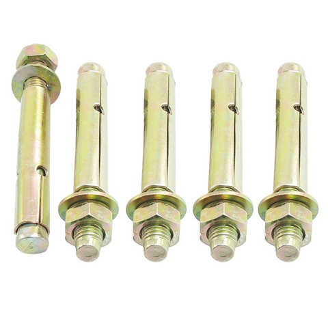 Первая и основная – стальная шпилька, имеющая на одном торце коническое утолщение, а на другом метрическую резьбу того или иного диаметра. Второй элемент – стальная полая трубка, имеющая две прорези, позволяющие ей раскрываться подобно лепесткам цветка. Третья и четвертая детали анкерного болта – шайба и гайка, навинчиваемые на резьбовую часть шпильки, которые в некоторых вариантах изделий объединяются в одну деталь.
