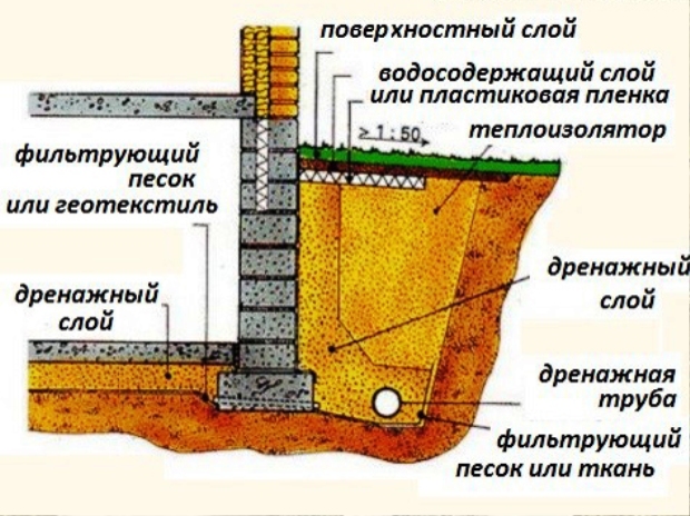 Дренажную трубу необходимо закладывать на 30 – 50 см ниже уровня фундамента и на расстоянии от полутора до трех метров от дома, организовав между ней и домом глиняный замок и выполнив песчаную отсыпку вокруг фундамента дома для лучшего дренирования. Обязательна хорошая гидроизоляция фундамента. Такой вид дренажа называется траншейным.
