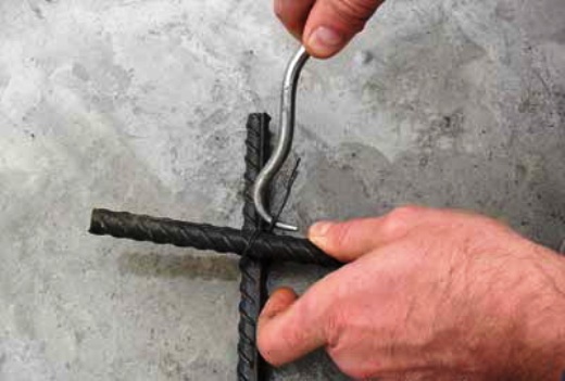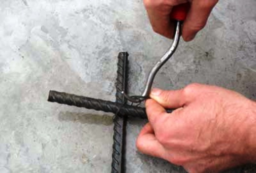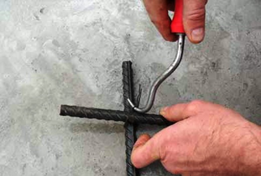 Для увязки арматурного каркаса с помощью проволоки самый дешевый и простой инструмент – металлический крючок. Чтобы с его помощью сделать узел на перекрестии прутков, нужно отрезать кусок проволоки длиной около 20 сантиметров.