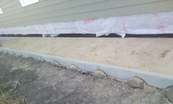 Геотекстиль также укладывается на самый низ земляного корыта, а под гарцовочной смесью прокладывается еще один слой гидроизоляции с запуском на стену на высоту чуть выше этой засыпки. Между облицовкой цоколя и тротуарной плиткой оставляется небольшой зазор для компенсации зимнего пучения грунтов, который впоследствии также заполняется песком или гарцовкой.